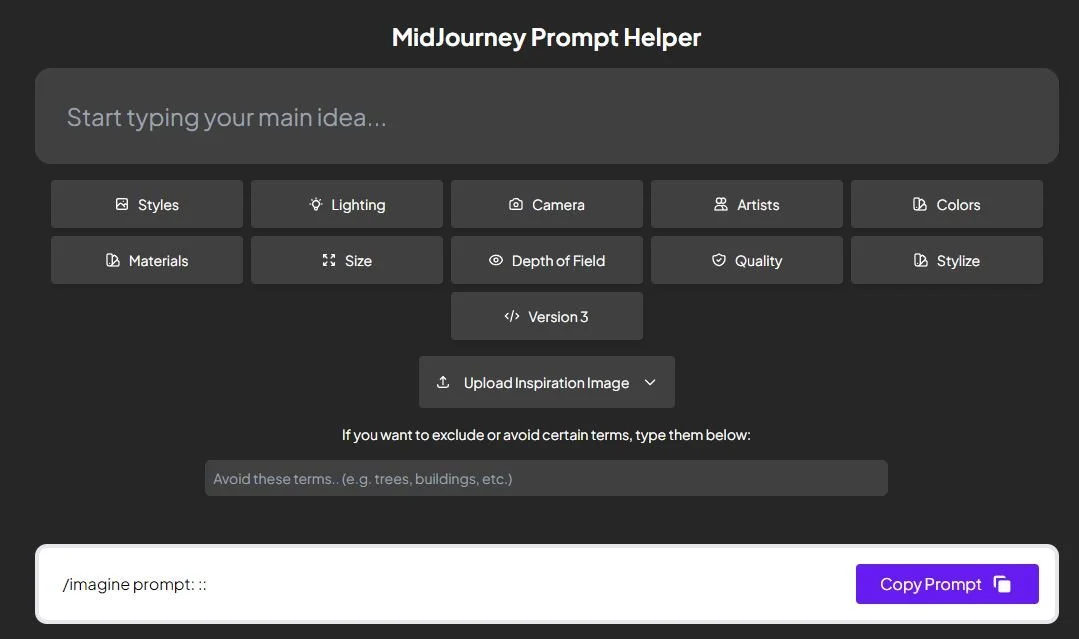 There is a prompt assist tool available for both MidJourney and DALL-E. You can use it to control what you are looking to create. It includes styles, lighting, camera, artists, color, materials, size, depth of field, quality, stylize, version and image input control. It automatically fills out a text prompt you simply copy into Discord and that’s it. (some tweaking can be done in Discord after).