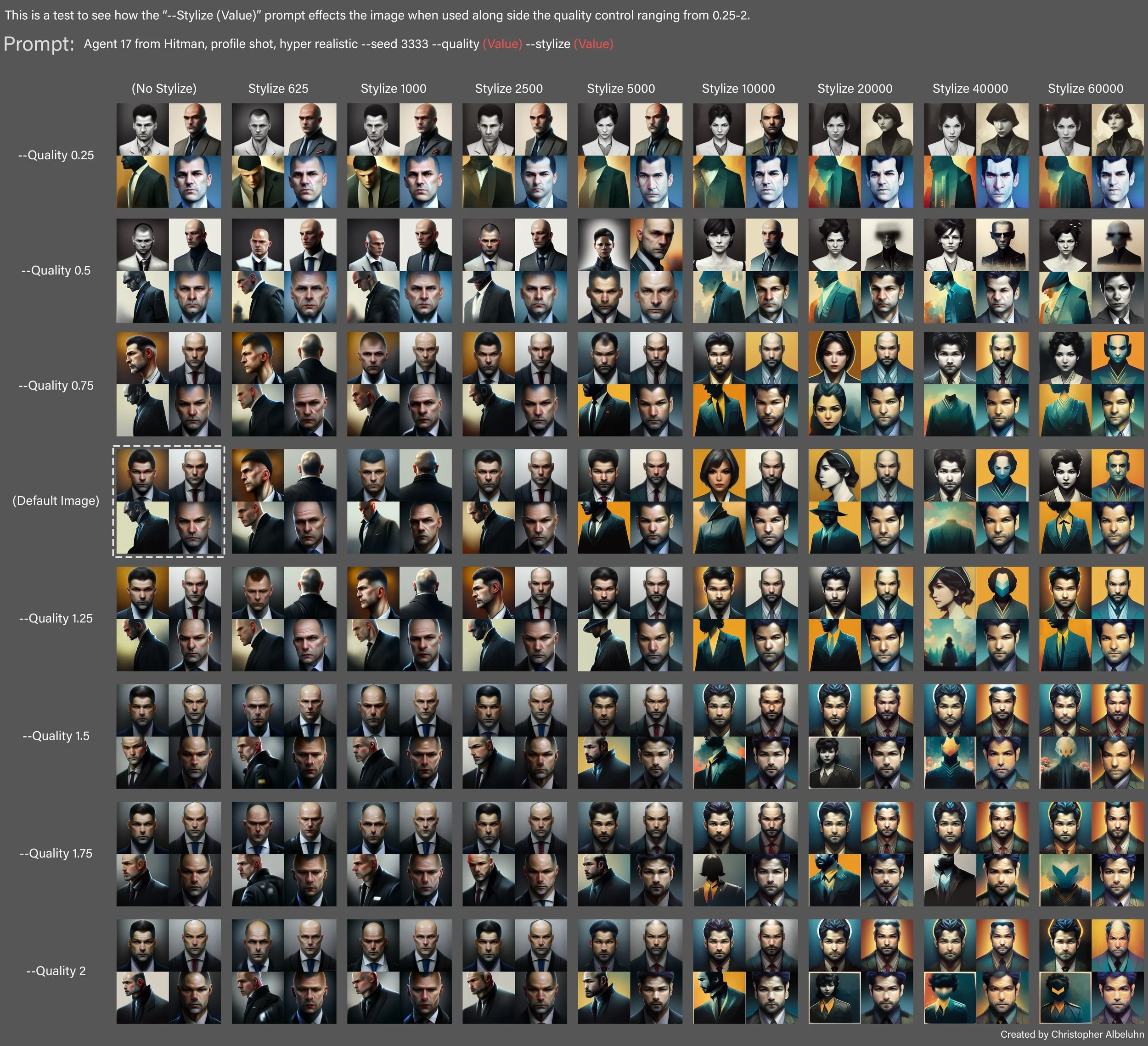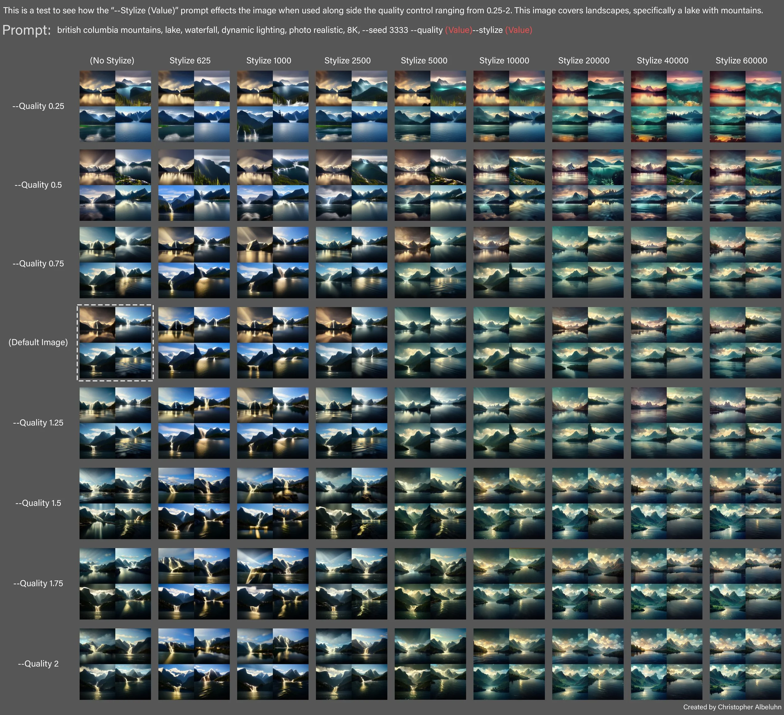 There are various ways you can control your images. “Quality” and “Stylize” are two fantastic features. Below is an image that shows the different effects the combinations of these features have based on the values used. The white outlined image is the default generated one with no ‘quality’ and ‘stylize’ input.