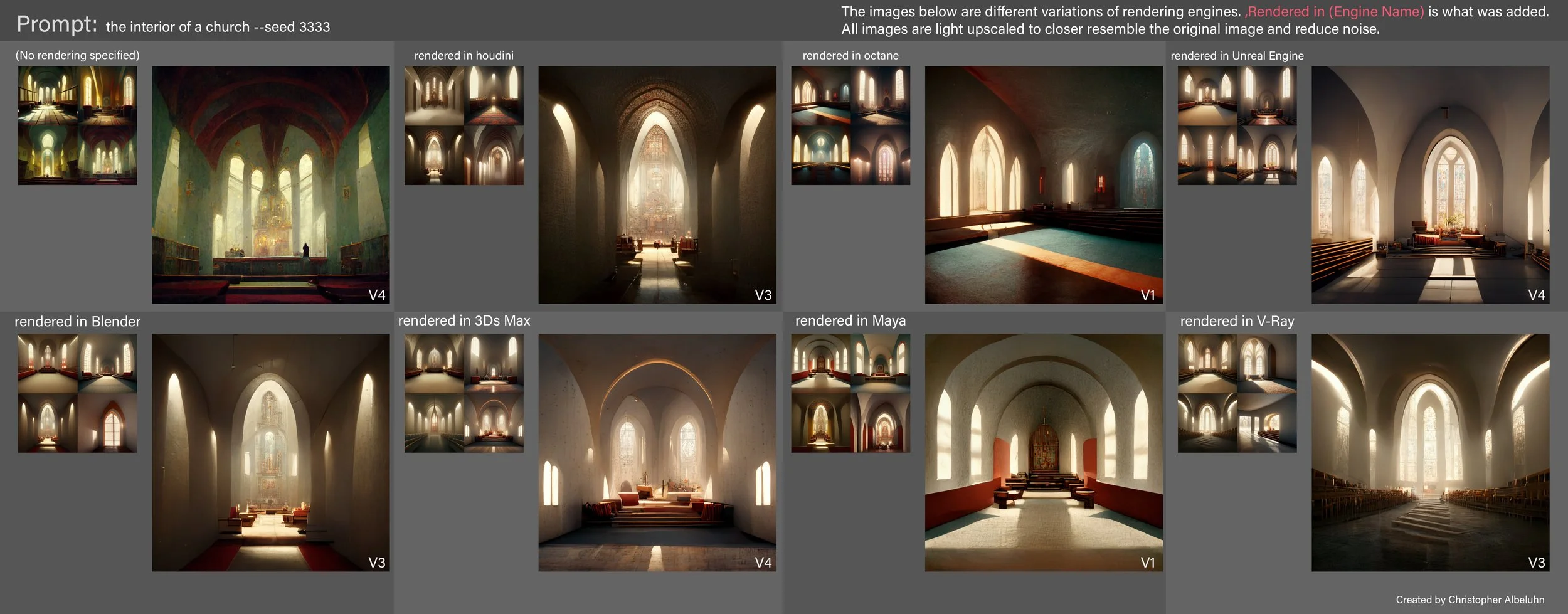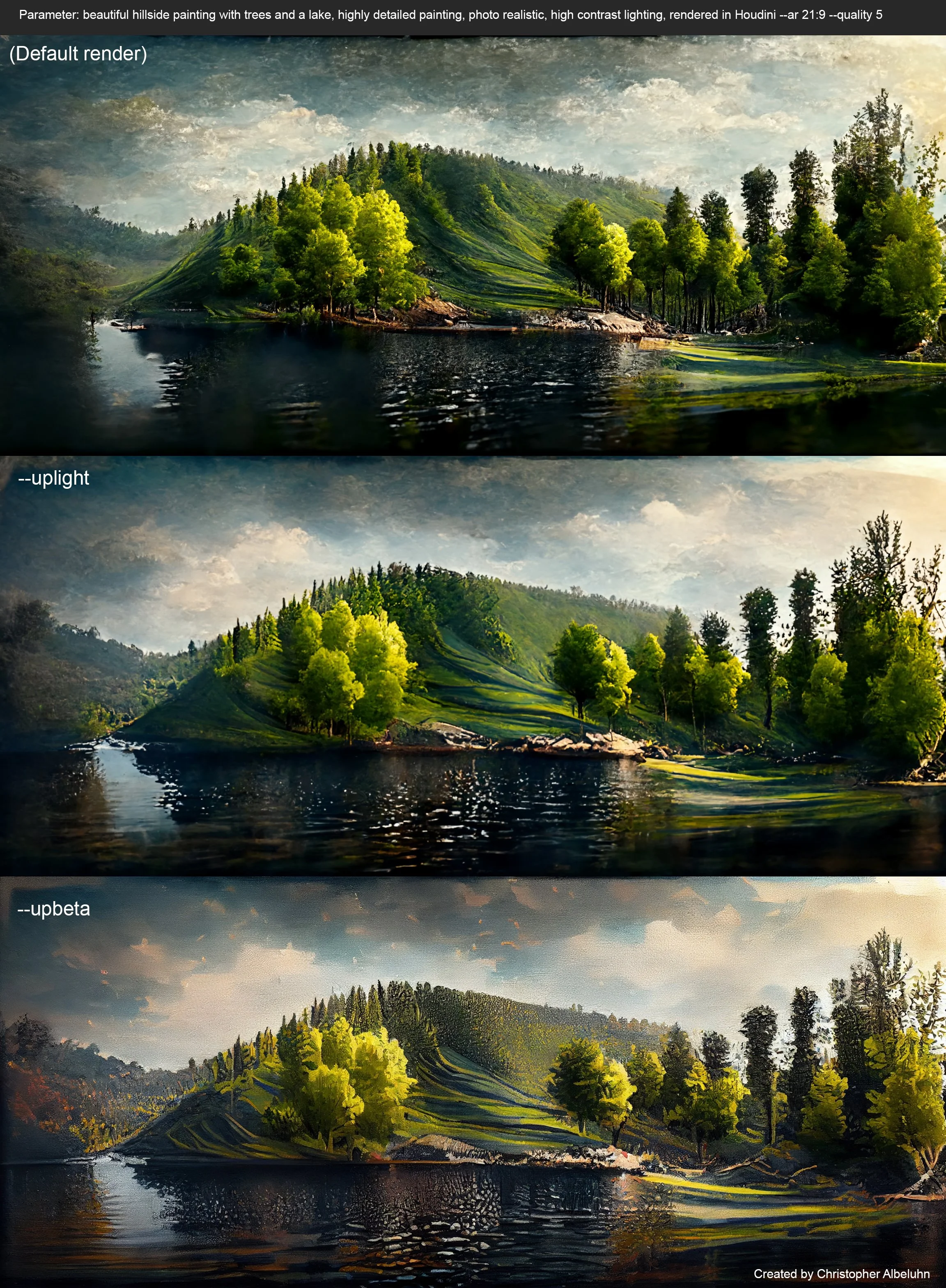 Depending on what you’re wanting to create, different rendering methods can be used. This is a comparison of the default render, an “uplight” render, and an “Upbeta” render. Keep in mind, I’m telling it to create a painting here. By default, the use of -Upbeta usually cleans up images, but this is still AI that we’re trying to tell what to do, and it will still take into consideration other elements of your input.