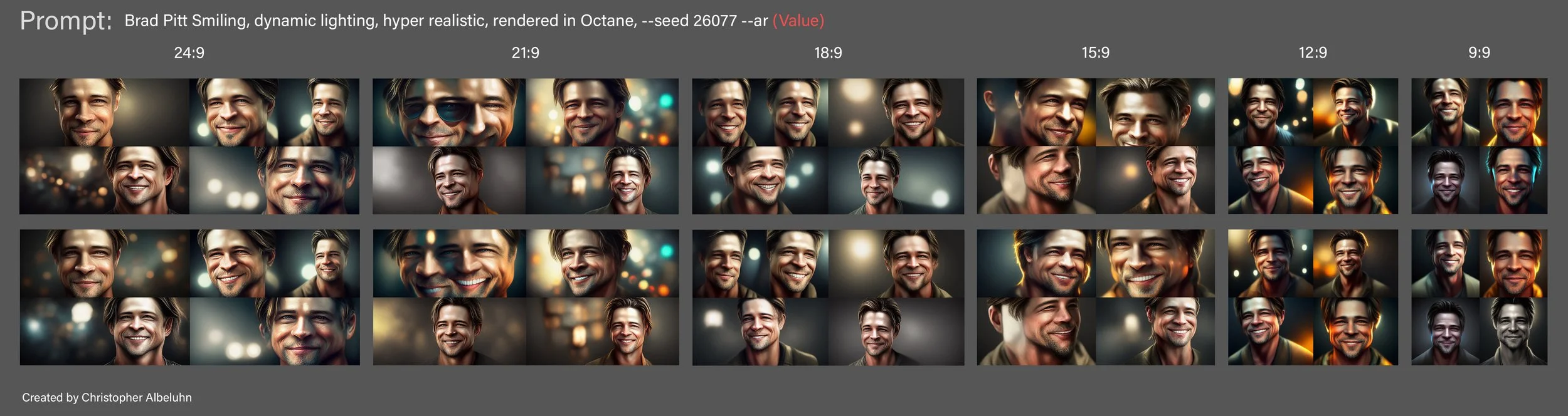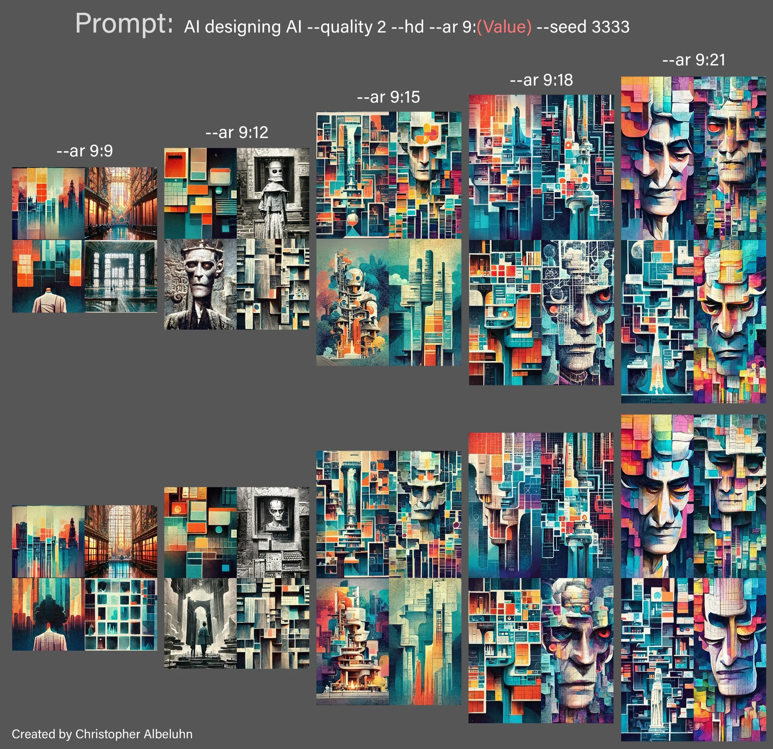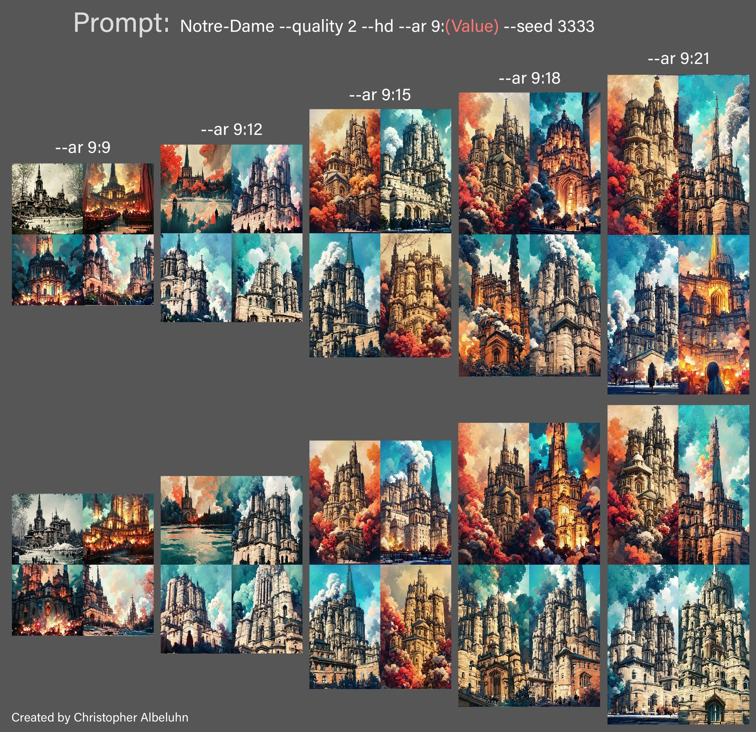 I have created some images using a seed (which tries to maintain a similar image, but gives subtle differences), and changed the aspect ratio to see how said ratio changes how the images look. Exterior buildings, Interior buildings, Abstract art and people are all shown below.