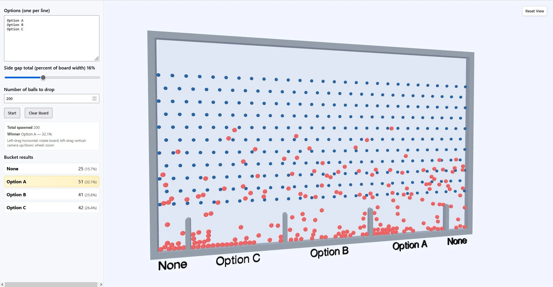 The ‘none’ is there on either side because randomization gets lost when the balls are bouncing on the walls. Having these pushes the ‘none’ catagory to being the winner at times, but that’s what the percentage readouts are for.