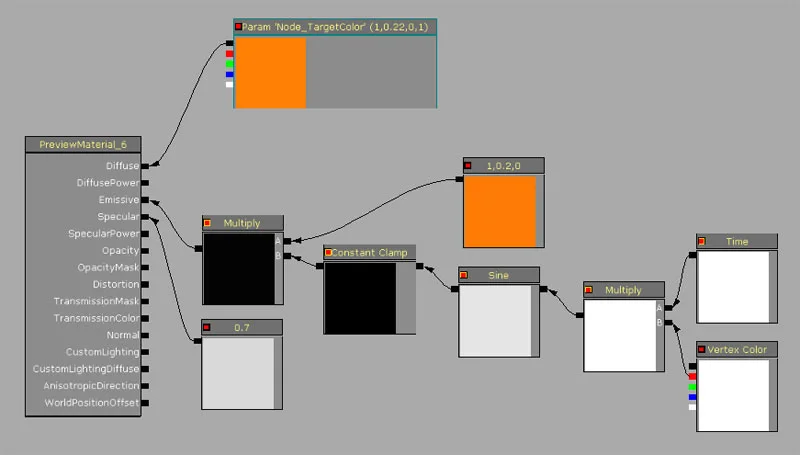 The biggest problem with this is we'll be using the 'Sine' node and multiply it by the orange color, but if we do that, the negative will push the 'orange' to the other side of the color spectrum, so we need a 'constant clamp' to limit this value.