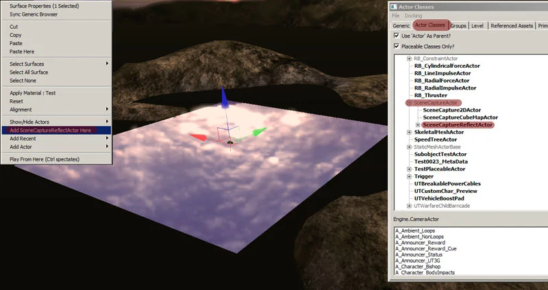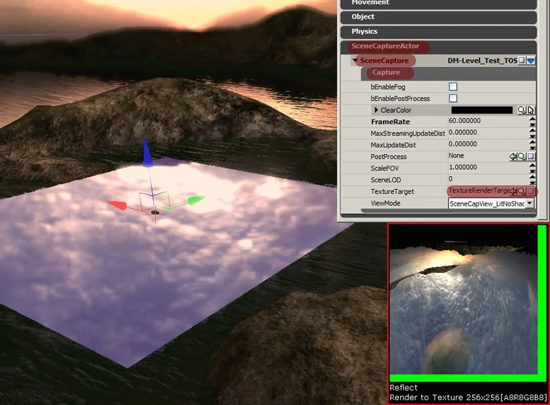 What you now need to do is select your 'RenderToTexture' you just created in the general browser window, click on the 'SceneCaptureReflectionActor' previously placed in the scene, open its options and navigate to 'SceneCaptureActor/ SceneCapture/ TextureTarget and click the green arrow. This will link whatever the 'reflection actor' sees into the 'reflection texture' you just made and create a texture based on its size in the X and Y. Please pay close attention to the 'FrameRate'. In nearly every case, the default frame rate of 1000 can greatly be lowered down to 60 if nor lower.