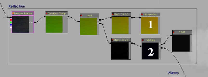 2. This is where the coardinates for the 'SceneCaptureReflectActor' is set. You will need a 'Screen Pos' node for this and then mask it by Red and Green since we only need two axis. This is then added to the multiply of the waves we worked on earlier. The reason we masked out the Red and Green is because that will add height to the screen position. If you want the height to be stronger, increase the constant that is plugged into the multiply. The higher this is, the more intense the waves will be, likewise, the smaller you make it, the calmer the waves.