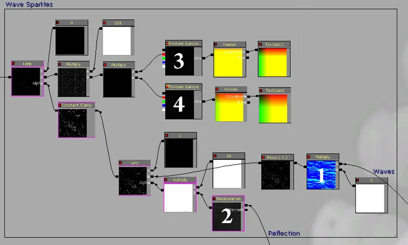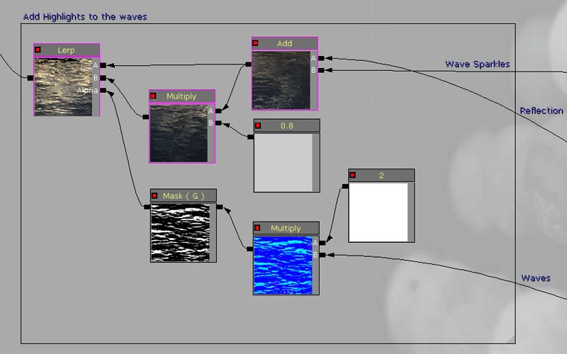 The 'Wave Sparkles' and 'Reflection' sections are added to one another. The original needs to be attached to the A of a lerp, and a version multiplied by 0.8 into the B. The 'Waves' need to be multiplied by 2 to increase their intensity, masked in the Green channel and plugged into the alpha of the Lerp. This adds the sparkles and waves together and tweaks the intensity of the waves based on the 'green' channel of the normals. If you want the waves to be lighter or darker, tweak the 0.8 value.