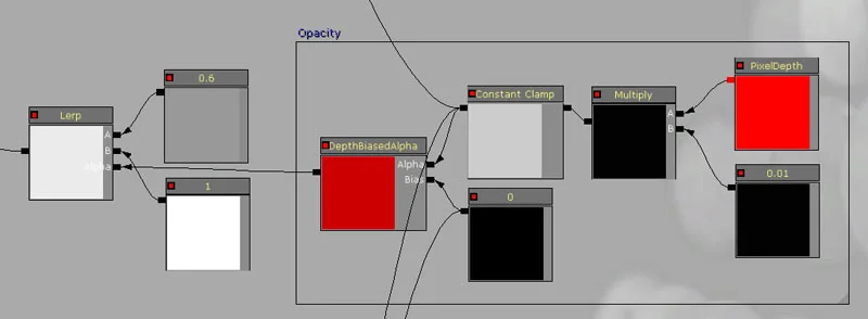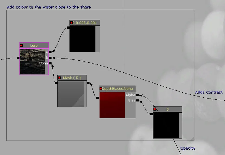 Since the water gets more and more shallow, we need another 'Depth Biased Alpha' to tweak how far away from the shore the waves will be, and the intensity they will have. If you plug in the 'Constant Clamp' from the 'Opacity' section into the alpha of the 'Depth Biased Alpha' node, give it a 'Bias' of 0 and a 'Bias Scale' of 250, this should give you a good fall of for the shore line. This then needs to go into the 'Alpha' of a lerp node.