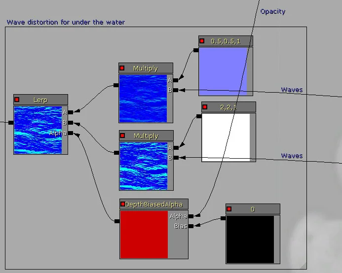 Next we need two multiplies, both for the waves. The first needs to be multiplied by 0.5, 0.5, 1 and the second by 2, 2, 1. The first one needs to go into A, (this is the shore line, that's why it was multiplied by less, to give less distortion) and the second into the B. The lerp then needs to be plugged into the 'Distortion' section of the shader.