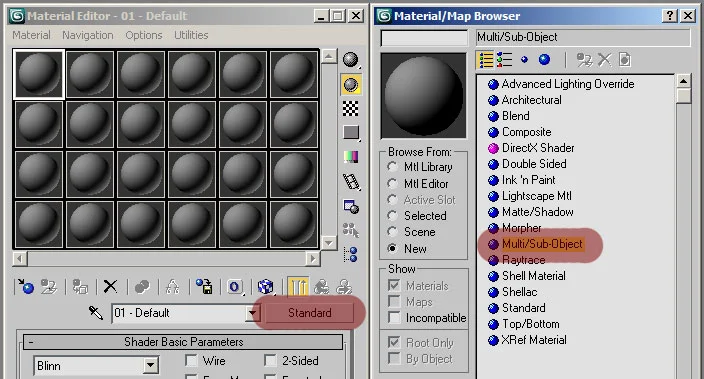 First you need to open up your material editor and select 'standard' this will open up an option list of all the available shaders. If you have 'Mental Ray' rendering enabled, these options will show up differently. If the multi sub is not in the list, go into your rendering option and change which rendering software you are using.