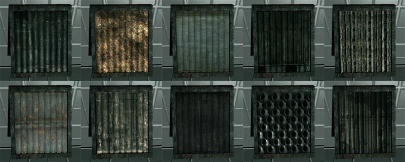 Square, Cylindrical, Bent pipes. Therese are just a few VERY basic shapes common in games. Notice that the materials for each repeat in the same direction. Some of them are slightly distorted in a certain exis or do not repeat quite the same, but the basic idea is there. If you create assets with the UV's uniform based on the size of the asset and have the uv's facing all in the same direction, it is very easy to interchange the materials.